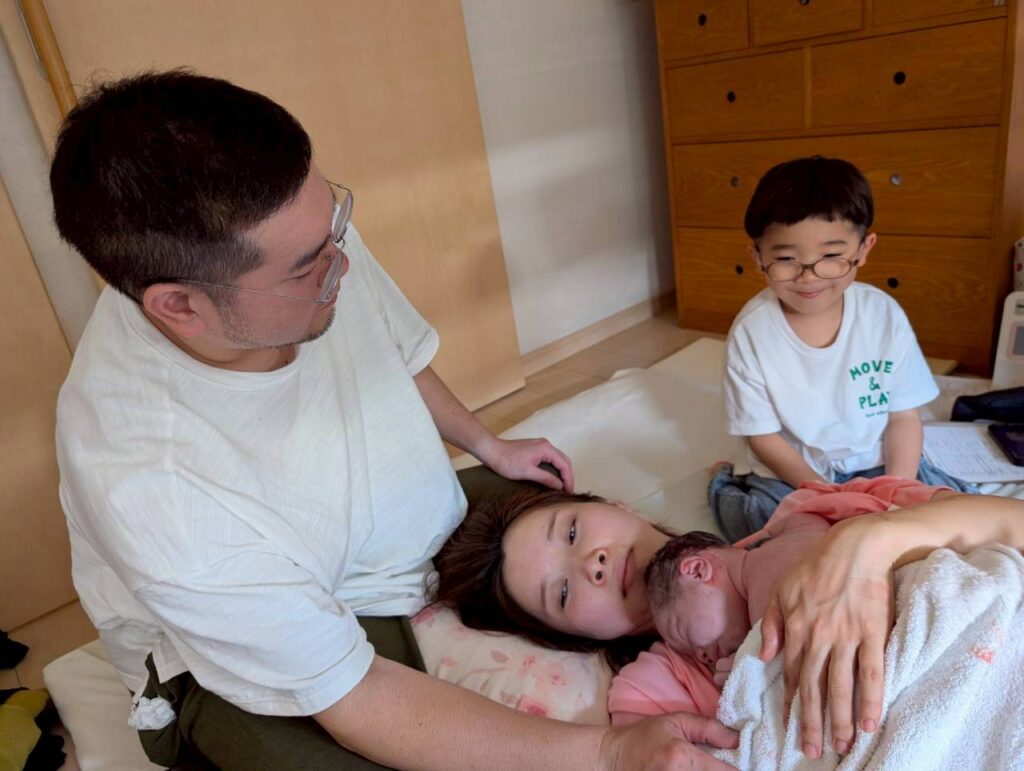 パパにつかまり、お兄ちゃんが応援する中で赤ちゃんは生まれました。