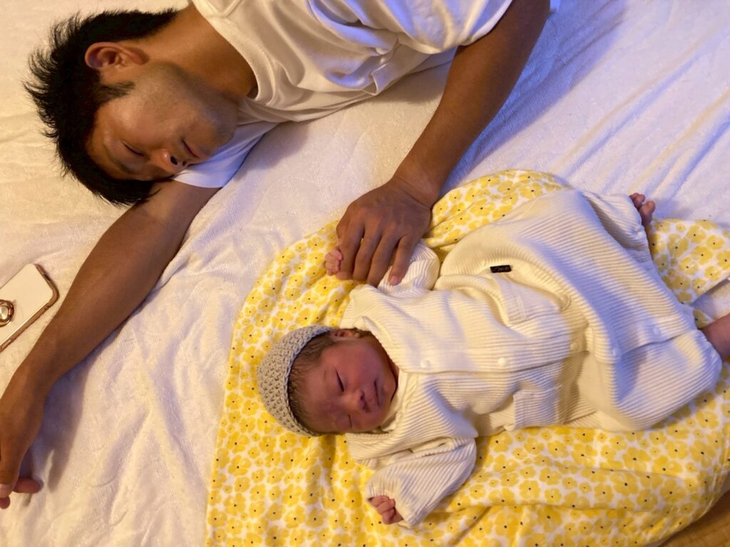 赤ちゃんが生まれた後はパパも安心して爆睡です。赤ちゃんと手をつないでほほえましい1コマです。