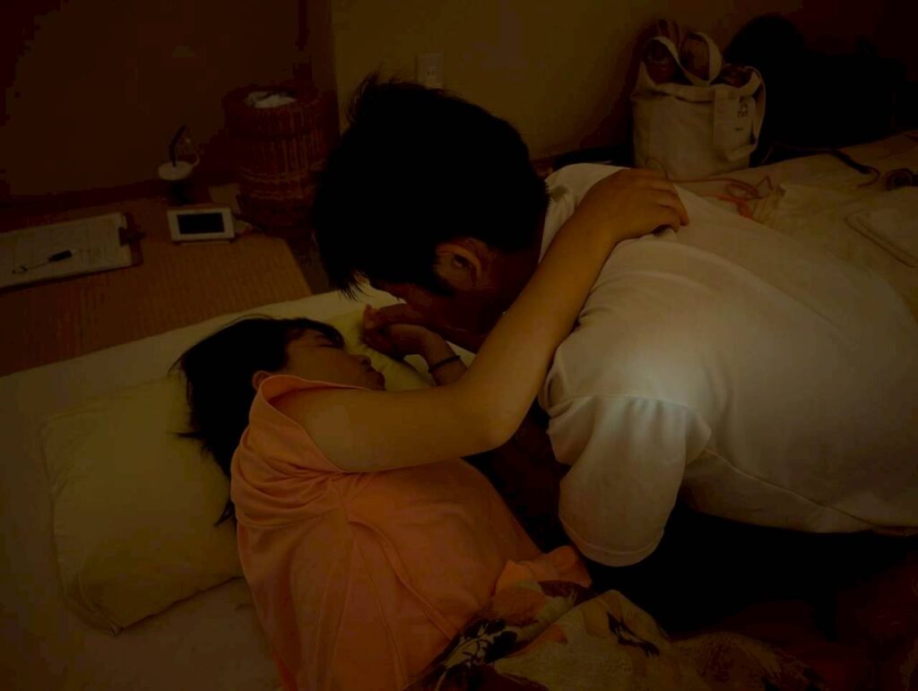 夜中にゆっくり、ゆっくり進むお産でした。うとうとしながらパパとともに過ごしていきました。