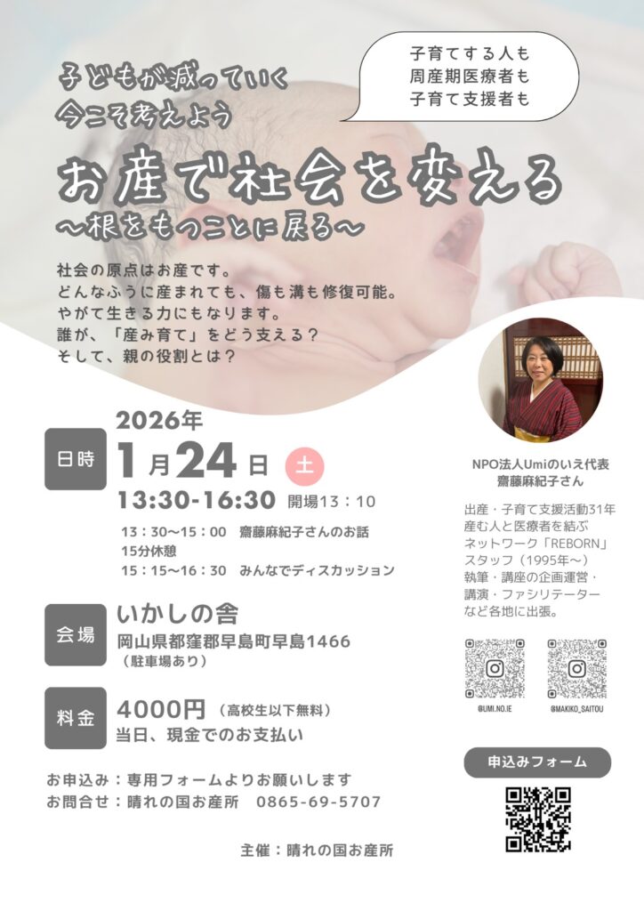 NPO法人Umiのいえの齋藤麻紀子さんのお話会します。 2025.12.15 横浜のUmiのいえの齋藤麻紀子さんを岡山にお呼びしてお話会をします!!みんなで「お産」を中心にこれからの明るい未来に向けてお話していきましょ♪♪ ぜひ、いっしょにお話しましょ❤️申し込みは以下から↓ 申し込みフォーム