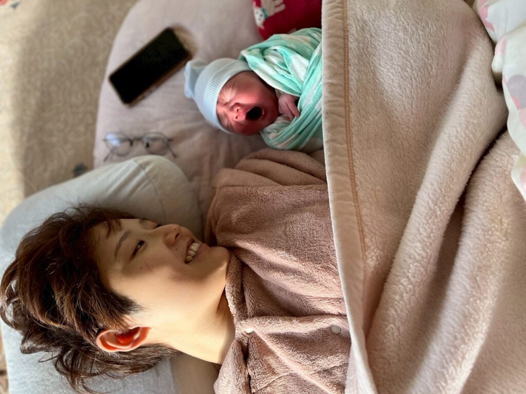 もうすぐ赤ちゃんに会えるよーというときにはパパもママも一緒に手を添えて赤ちゃんをお迎え。家族でみんなで乗り越えたお産でした。